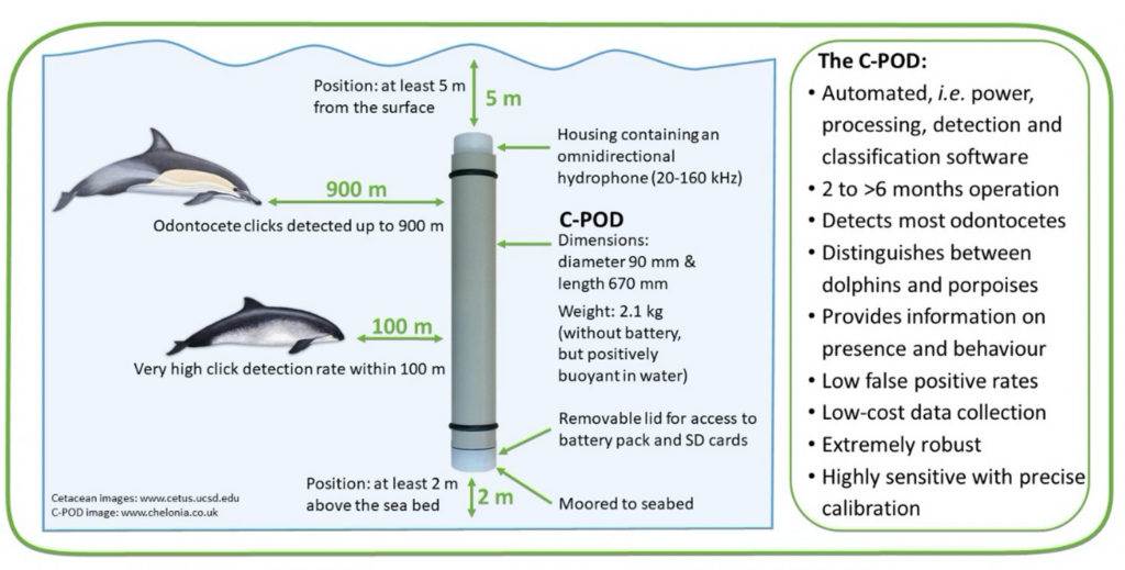 Clicks resembling those produced by odontocetes (toothed whales, dolphins and porpoises) arise from various sources, but not in the semi-regular sequences called ‘trains’ that are specific to the echolocation of these animals. The T-POD and C-POD (www.chelonia.co.uk) are able to implement train detection for odontocetes. The output has been experimentally validated against visual and acoustic observations in many environments to monitor a diverse range of species, including deep-diving beaked whales. These static autonomous click detectors are relatively low-cost systems, for which we have a proven track record for pioneering work with excellent results. Researchers typically deploy numerous PODs and accept the often high probability of losing some units or worse, but, to date, our own custom-designed deployment and mooring configurations have secured a 96% recovery rate after hundreds of deployments for commercial clients in a variety of different environments.